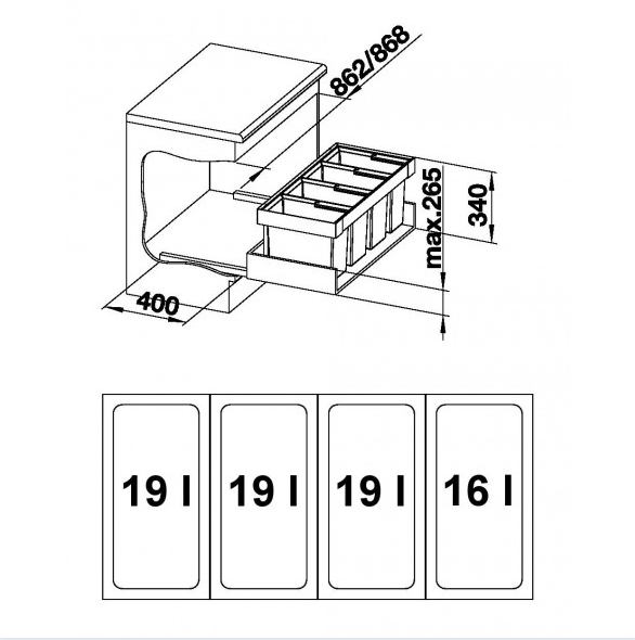 Rozložení nádob: 3 x 19 l + 1 x 16 l Košový systém do zásuvky Šířka skříňky: 90 cm Rychlá a snadná montáž Systém s přesným rámem pro nádoby a sladěnými barvami Snadná přístupn ...Více informací