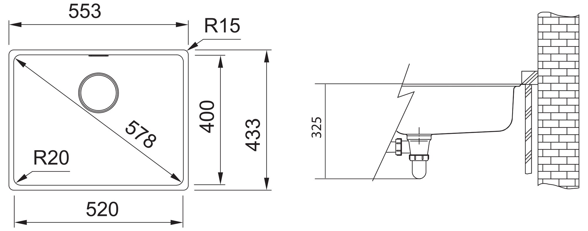 - Rozměr dřezu: 553 x 433 mm